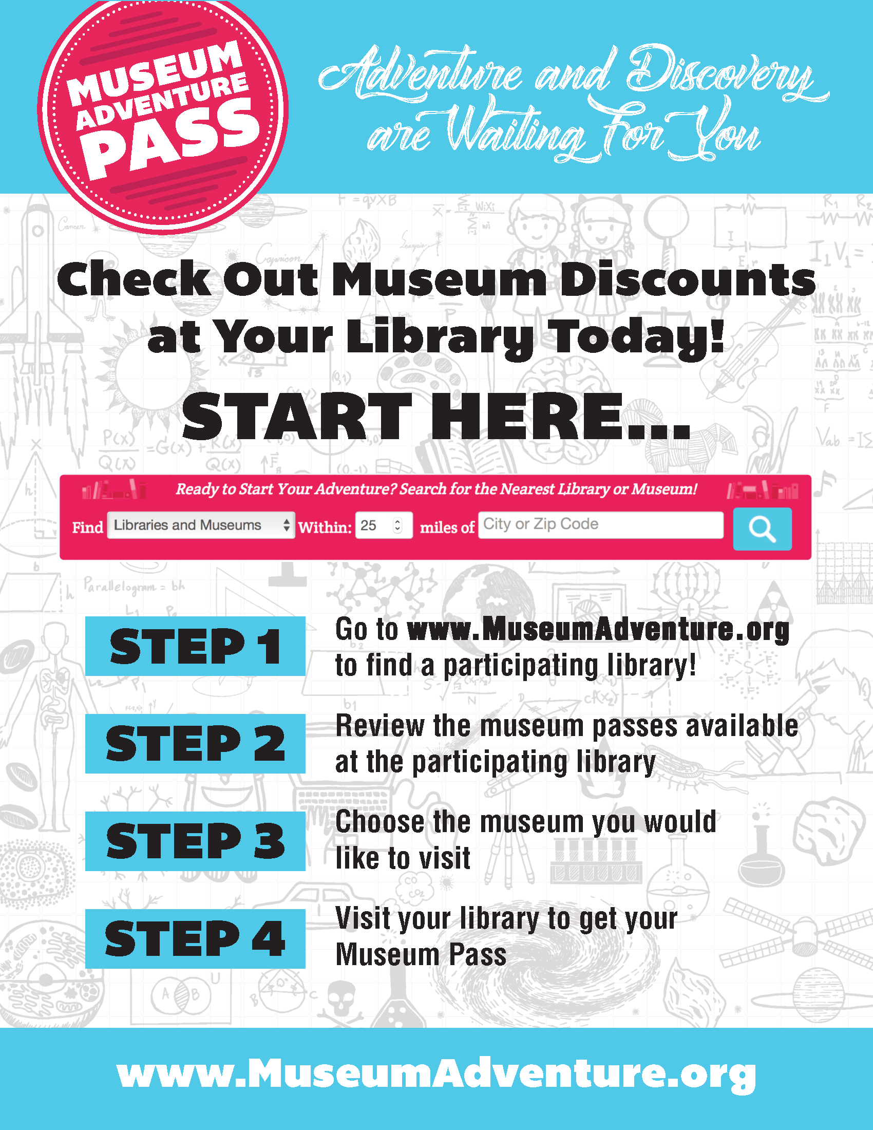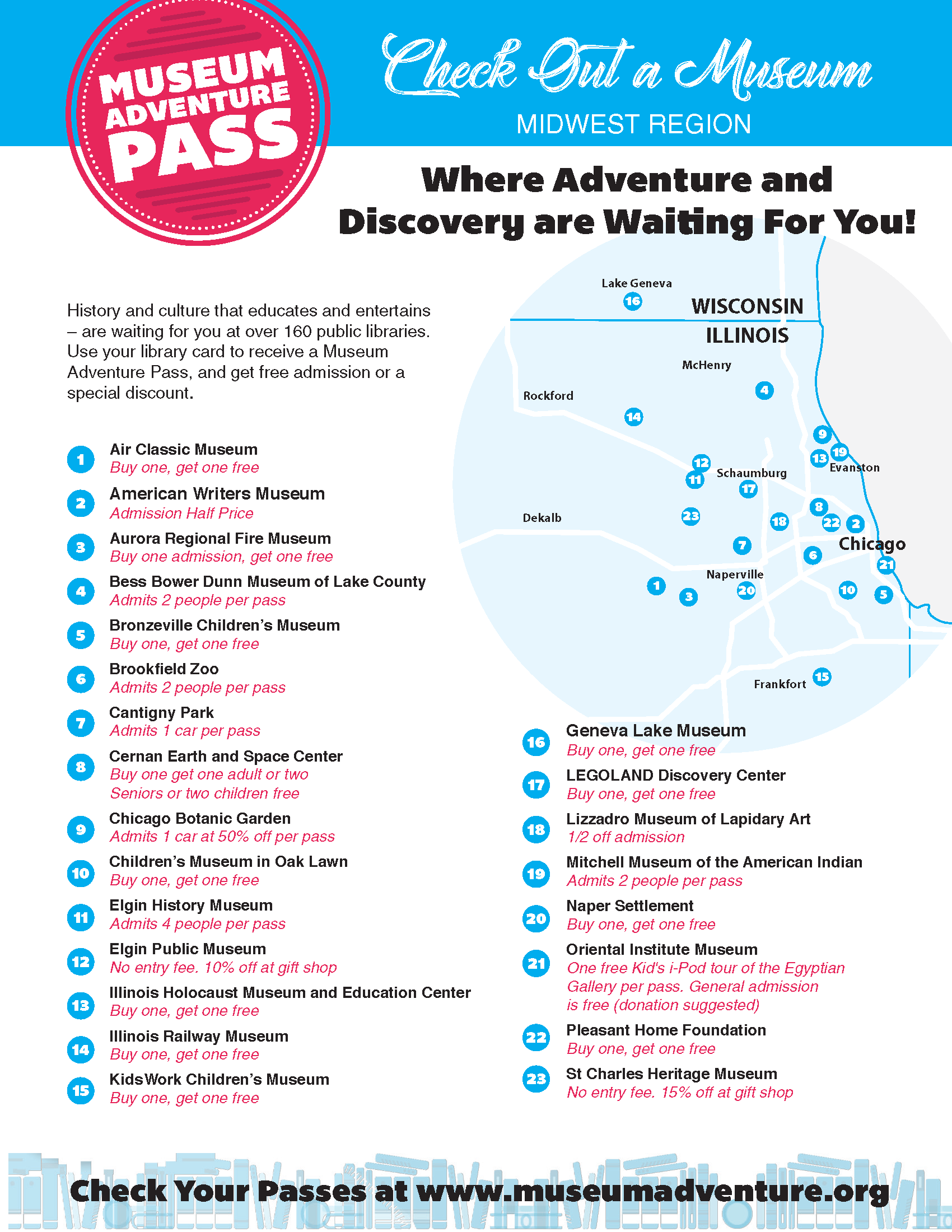 1. Check out a Museum Adventure Pass using your library card at your home library. Libraries have a limited number of passes for each participating organization. Passes are available on a first-come, first-served basis. Passes may be reserved and received online, but not by phone. We look forward to your library visit!